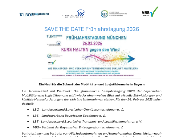 • Save the Date: Am 26. Februar 2026 findet in München ein gemeinsamer Kongress zu Logistikthemen zusammen mit LBT e.V., LBS e.V. und LBO e.V. statt. Mit dabei sein wird als Vortragender auch Wirtschaftsminister Hubert Aiwanger MdL. Nähere Infos entnehmen Sie bitte dem beigefügten Flyer unten.